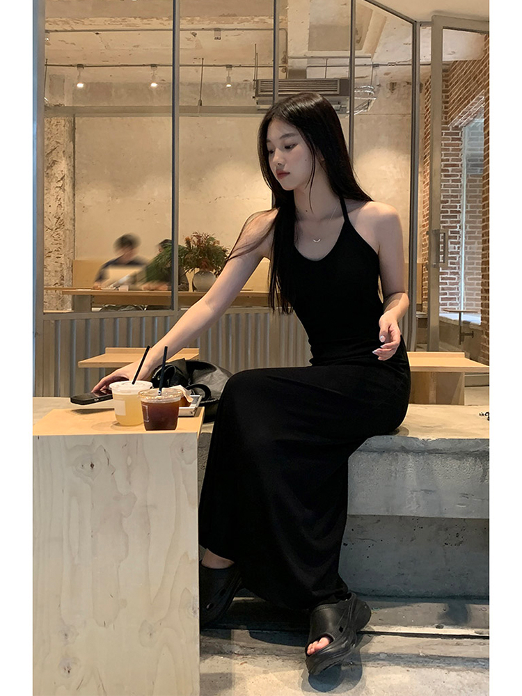 / 红人馆挂脖连衣裙女夏季新款黑色高级垂坠感长裙气质超火吊带裙子